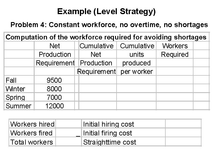 Example (Level Strategy) Problem 4: Constant workforce, no overtime, no shortages Computation of the workforce required for avoiding shortages Net Cumulative Workers Production Net units Required Requirement Production produced Requirement per worker Fall 9500 Winter 8000 Spring 7000 Summer 12000 Workers hired Workers fired Total workers Initial hiring cost Initial firing cost Straighttime cost