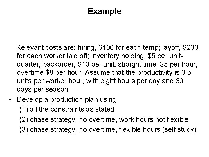Example • Problem 2 sample computation: Workers required in fall = production hours required in fall / number of working hours per worker in fall [Note: the result should be rounded up, the number of workers is an integer and enough workers should be hired to avoid shortages] = 19, 000/ (60 days per season 8 hours per day) = 39. 583 rounded up to 40 Number of workers hired in fall = Number of workers required in fall - number of workers available in the beginning of fall = 40 - 30 = 10