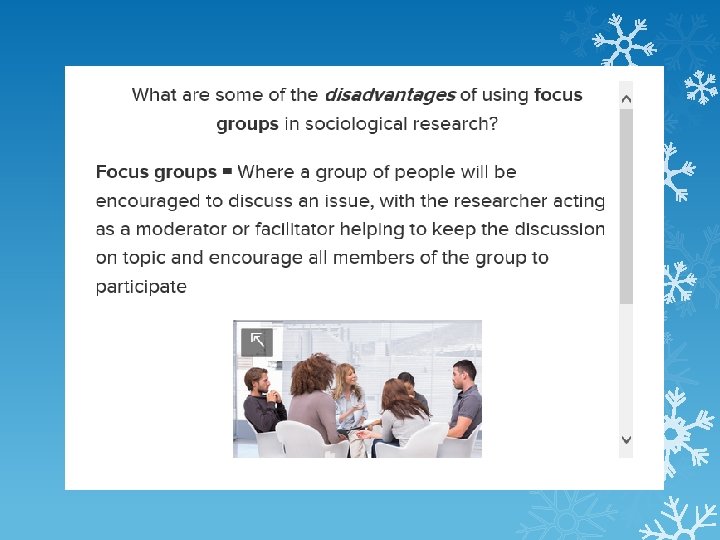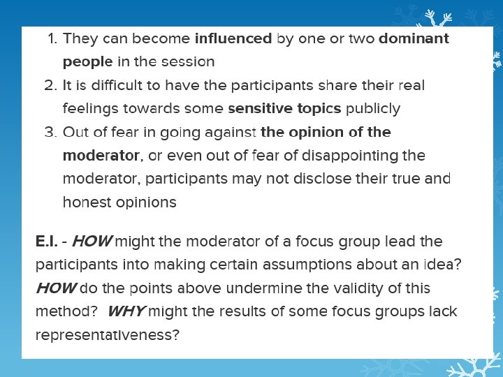 Group Interviews Done with multiple interviewees at the same time WHEN MIGHT THIS BE USEFUL OR APPROPRIATE? This is used when the researcher is particularly interested in the interaction between the people being interviewed Group interviews can be transformed into focus groups if you do more than simply ask questions (e. g. case study material, card sorts, deciding a list of priorities etc. ) It is argued that focus groups provide a supportive environment for people to express themselves https: //www. youtube. com/watch? v=ZLw 0 YXcse. G 0