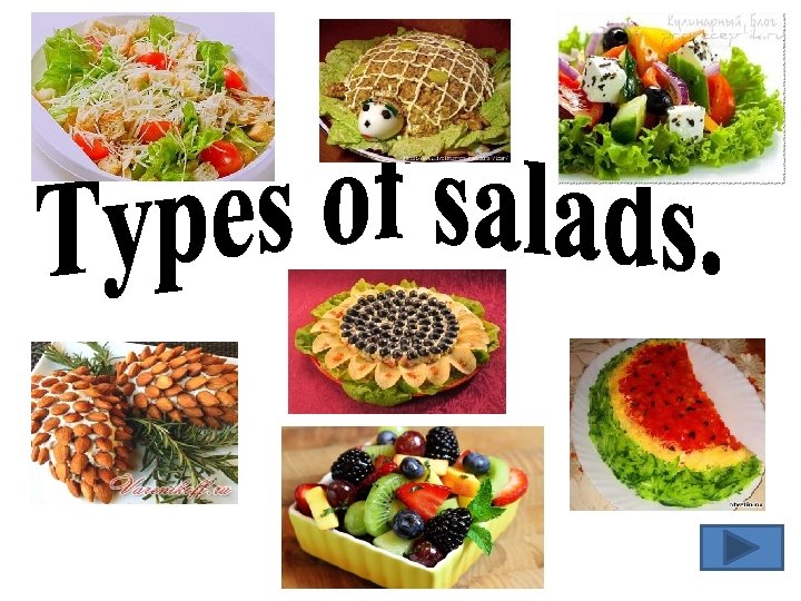 Types of salads Salad as an appetizer Consists of different fresh vegetables (tomatoes, cucumbers, black or red onions, green onions, paprika), lettuce or cabbage, parsley or celery, black olives. It is dressed with olive oil, mayonnaise or sour cream. Salad as a side dish Consists of different vegetables, usually served as a garnish for any dish. Salad as a main course Salad as a dessert It is usually a combination of cold meat, fish or poultry, macaroni and is served with a variety of vegetables, fruits or dairy products. It is made by different fruit (melon, tropical fruit, berries, oranges, kiwis, bananas).