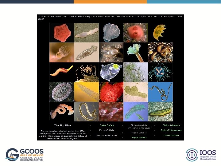 National Science Education Standard or Ocean Literacy Essential Principle Learning Goals Unifying Concepts and Processes 1. Systems, order, and organization Types of organization provide useful ways of thinking about the world. Unifying Concepts and Processes 5. Form and Function Form and function are complementary aspects organisms in the natural world. A. 1: Abilities necessary to do scientific inquiry Ask a question about objects, organisms, and events in the environment. C. 1: Characteristics of organisms Each plant or animal has different structures that serve different functions in growth, survival, and reproduction. Principle 5 (K-2: A) The ocean supports a great diversity of life and ecosystems. There is a great diversity of organisms in the ocean. Principle 5 (K-2: A. 4) The ocean supports a great diversity of life and ecosystems. Ocean organisms have a variety of different structures and behaviors that help them to survive in the ocean.