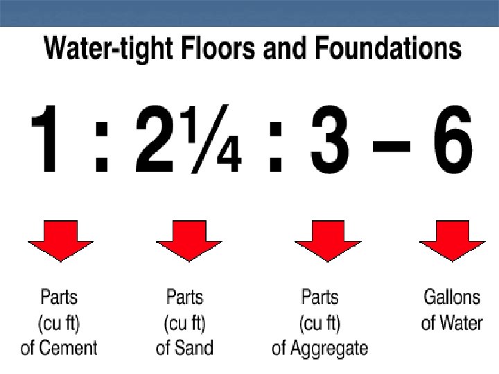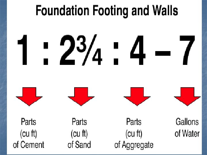 Mixing Ingredients n Gallon mix: Number of gallons of water used with a bag of cement. n Less water means stronger concrete