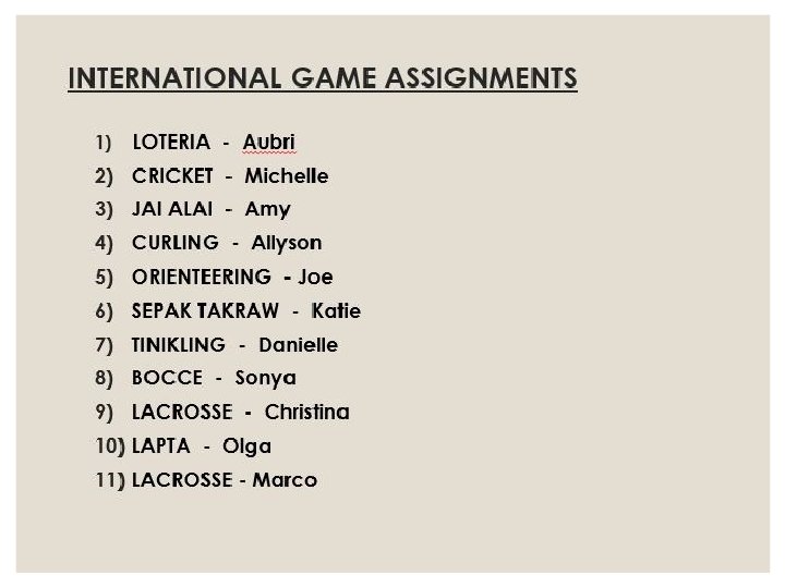 Cultural Integration INTERNATIONAL GAMES Research your game (THIS PROJECT IS DUE WEEK 13) I. Submit your work online • Include the country of origin, dates, brief history, type of game (field, team, individual, net, board, etc. ), brief rules, and sources of information • Your summary reflection • Include pictures and/or diagrams and an “official” website homepage image II. Download the Passport 2 Play Teacher’s Guide (pdf) • Include a brief summary of the Passport 2 Play guide content and your reflection on it • Be prepared to share your game
