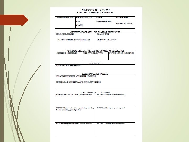 COMPONENTS OF A LESSON INTO: ►Objective (what is the goal of the lesson? ) ►Content Standards ►Anticipatory Set or “Hook” THROUGH: ►Teaching (input, modeling, checking for understanding) ►Guided Practice (activity) BEYOND: ►Closure ►Independent Practice (homework)/ Application/ Extension of activity Kovar/Combs/Campbell/Napper-Owen/Worrell. 2007. Elementary Classroom Teachers as Movement Educators. 2 nd ed. New York: Mc. Graw-Hill Higher Education. All Rights Reserved.