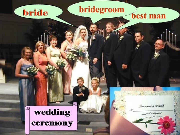 Indonesian families only invite people F 1. they have known for a long time. F 2. The reception is before the wedding. T 3. Guests usually give money as a present T 4. In Greek culture , the bridegroom has to ask for the bride’s hand in marriage. F 5. The bride and bridegroom’s wedding crowns are made of gold. T 6. A piece of ribbon links the wedding crowns together.