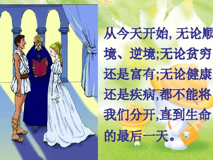 Greek Weddings before the wedding ceremony The groom has to ask the bride’s father for his daughter’s hand in marriage. during the wedding ceremony The best man should help the priest to put crowns on the heads of the couple. has to to link the crowns to A long silk ribbon has symbolise a happy and long life for the couple. after the wedding ceremony The guests can attend a wedding reception. Guests can smash dishes on the floor and pin money to the bride’s dress for good luck.