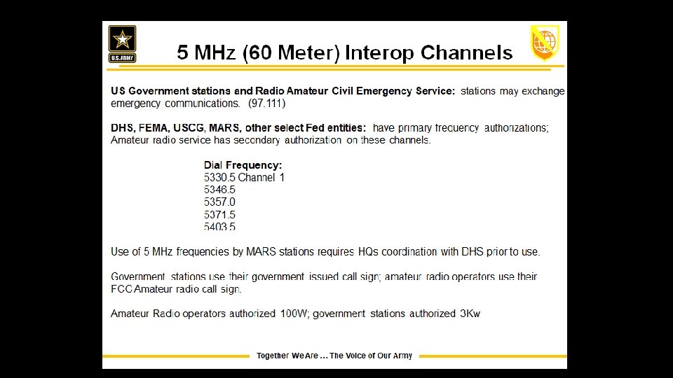 Do. D Interoperability Exercise • Do. D Communications Interoperability Exercise this weekend (4 Nov – 6 Nov 2017) • Do. D will request county-by-county status reports via MARS organizations; MARS will interface with Amateur community • Primarily 60 -meter event • High-power military broadcast on 60 -meter Channel 1 (5330. 5 k. Hz) • 0300 -0315 UTC Saturday / 2200 -2215 CDT Friday • Informational broadcast on 13, 483. 5 k. Hz • 1600 -1615 UTC Sunday / 1000 -1015 CST Sunday (remember the DST time change!) • Will likely request reports in the MARS ‘CNTY’ format • Format: FIPS CODE, REPORT TIME, POWER STATUS, WATER STATUS, SANITATION STATUS, MEDICAL FACILITY STATUS, COMMUNICATIONS STATUS, TRANSPORTATION STATUS, SOURCE, LOCATION • Example: 19169, 051715, Y, Y, Y, A, Ames