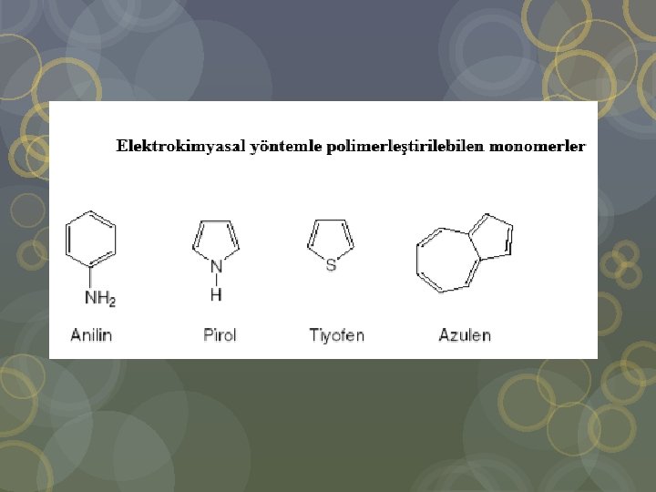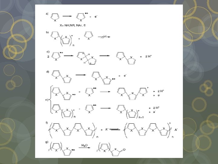 Konjuge polimerlerin tümü kimyasal yöntemle sentezlenebilmektedir. Başka bir çalışmada, çözücü olarak metanol, doping maddesi olarak 2, 5 M Fe. Cl 3 kullanılarak pirolün kimyasal yöntemle polimeri hazırlanmış ve iletkenliğinin 190 S/cm’e ulaştığı belirlenmiştir. Şekil’ de Beş halkalı heterosiklik monomerlerin kimyasal polimerizasyonu için önerilen mekanizma (X= NH, S, O)
