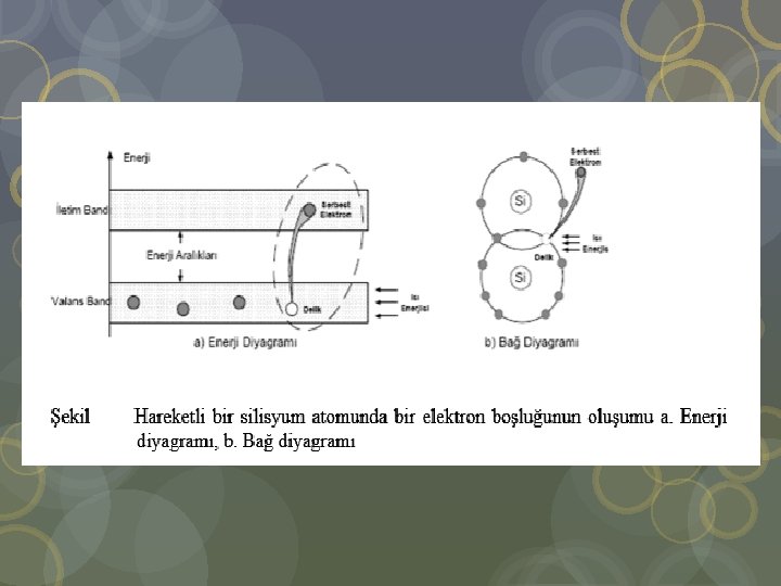Yarı-iletkenler: Elektrik iletkenliği, iletkenler ile yalıtkanlar arasında kalan maddelerdir. Band teorisi, yarıiletkenlerin elektriksel iletkenlik özelliklerini büyük bir başarı ile açıklar. Metallerde değerlik bandı ve iletkenlik bandı aynı olduğu halde, yarıiletkenlerde bu iki band, band eşik enerjisi ile ayrılır. Yarı iletkenlerin, düşük sıcaklıklarda değerlik elektronlarının enerji düzeyleri dolmuş durumdadır. Bu nedenle de elektriği iletecek serbest elektronlar yoktur ve normal durumda yalıtkandırlar. Ancak, sıcaklık yeteri kadar artınca, ışık, manyetik etki veya elektriksel gerilim gibi dış etkiler uygulandığında bazı elektronlar bulundukları düzeylerden iletkenlik bandına sıçrayacak kadar enerji kazanırlar ve değerlik bandındaki eski yerlerinde delik adını alan (+) yüklü bir elektron boşluğu bırakırlar ve iletken duruma gelirler yani oluşan eşit sayıdaki hareketli elektron ile delik, elektrik akımını iletebilmektedir.