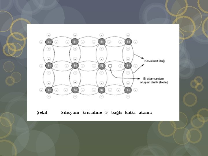 Silisyuma katkı maddesi olarak 5 valans elektrona sahip fosfor belli bir oranda eklendiğinde, diğer silisyum atomları ile nasıl bir kovalent bağ oluşturulduğu gösterilmiştir. Fosfor atomunun dört valans elektronu, silisyumun 4 valans elektronu ile kovalent bağ oluşturur. Fosfor’un bir valans elektronu açıkta kalır ve ayrılır. Bu açıkta kalan elektron iletkenliği artırır. Çünkü herhangi bir atoma bağlı değildir. İletkenlik elektron sayıları ile kontrol edilebilir. Bu ise silisyuma eklenen atomların sayısı ile olur. Katkı sonucu oluşturulan bu iletkenlik elektronu, valans bandında bir boşluk oluşturmaz.