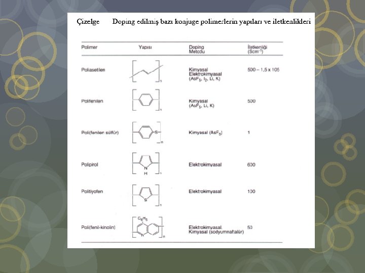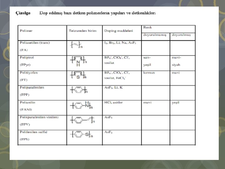 BAZI İLETKEN POLİMERLER Poliasetilen ilk araştırılan iletken polimerlerden birisidir ve değişik yollarla sentezlenebilir. Natta 1958 yılında, kendisinin de geliştirilmesinde önemli katkıları olduğu bugün Ziegler-Natta katalizörleri olarak bilinen katalizörleri, poliasetilen sentezinde kullanmıştır. Shirakawa, 1970’li yılların başında aynı katalizörü kullanarak farklı bir uygulamayla poliasetilen filmler hazırlamıştır. Poliasetilenin iletkenliği aşağıda anlatılacağı gibi, elektron verici bileşiklerle veya elektrokimyasal indirgenmeyle ya da elektron alıcı bileşiklerle veya elektrokimyasal yükseltgenmeyle arttırılabilir (doplama).