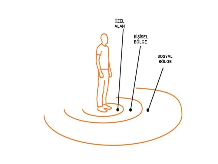 2. Bölge Mesafeleri 1) Mahrem Bölge (15 – 45 cm. arasında) : Sadece o kişiye duygusal olarak yakın olan kişilerin bu bölgeye girmesine izin verilir. 2) Kişisel Bölge (46 – 1. 22 cm arasında) : Kokteyllerde, ofis partilerinde, sosyal etkinliklerde ve arkadaş toplantılarında başkalarıyla aramızdaki mesafedir. 3) Sosyal Bölge (1. 22 – 3. 6 m. arasında) : Yabancılar ve çok iyi tanımadığımız kimselerle aramızdaki mesafe(postacı, bakkal vs. ) 4) Ortak Bölge (3. 6 metrenin üzerinde) Kalabalık bir gruba hitap ettiğimizde durmayı tercih ettiğimiz rahat mesafe.