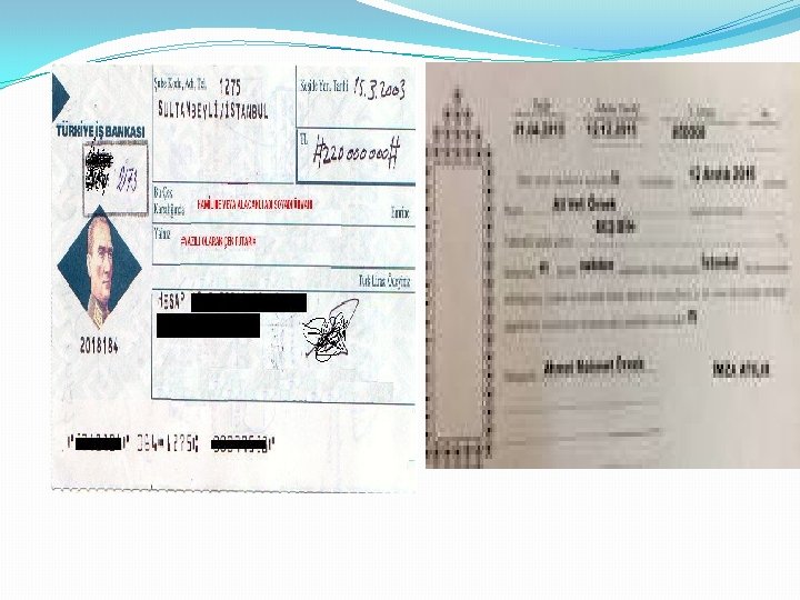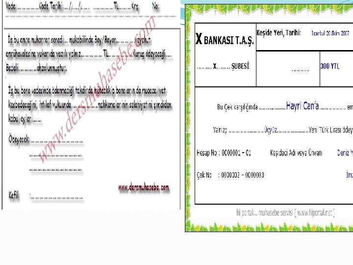 � Çek: üzerinde yazılı belirli tutarda bir paranın hamiline ya da belirli bir kişiye veya emrine ödenmesi için bankaya hitaben yazılan bir ödeme emridir. Çeklerde üçlü bir ilişki bulunmaktadır. � Muhatap sadece ya banka yada finans bir kurumdur. Herkes çek kullanamaz çek kullanabilmek için; � Banka ile çek kullanacak arasında bir anlaşma olmalı � Tasarruf edebileceği bir karşılık olmalı. � Çekin şartları 1. Çekin ibrazı 2. Kayıtsız şartsız ir bedelin ödenmesi emri 3. Ödeyecek kimsenin adı ve soyadı 4. Ödeme yeri keşide günü ve yeri 5. keşidecinin imzası