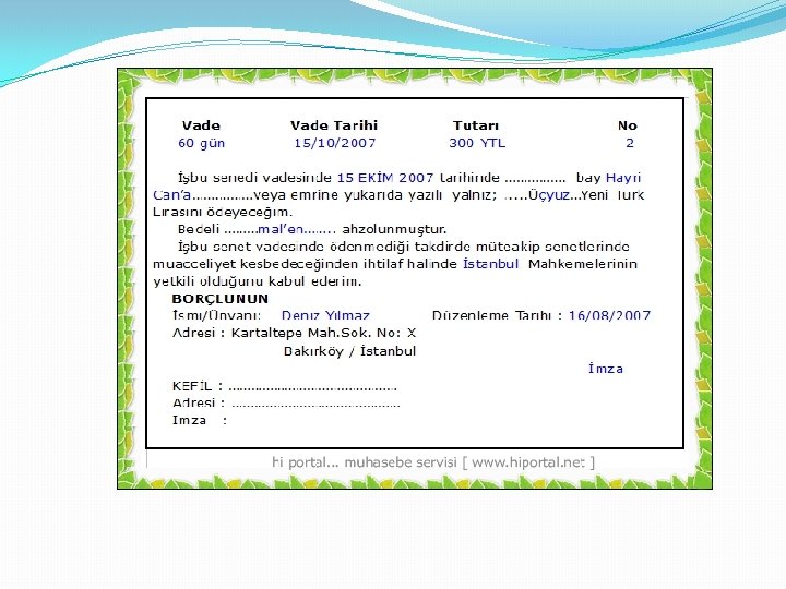 �Devir şekli �Nama yazılı senet: üzerinde ilk alacaklının adı yazılı olduğu ve emrine kaydını içermeyen senettir. �Emre yazılı senit: üzerinde ilk alacaklısının adının yazılı olmakla birlikte ayrıca onunu emrine kaydı taşıyan senettir. ( bono, çek, çelik örnek gösterilebilir) �Hamile yazılı senetler: hamili kim ise onunu hak sahibi sayılacağı senettir. Devir için özel bir şekil yoktur. örnek çek (bono poliçe yazılmaz)