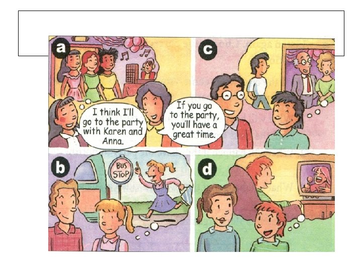 1 a. match the statements with the pictures. Statements ___I c think I’ll wear jeans to the party. d think I’ll stay at home. ___I b think I’ll take the bus to ___I the party. a think I’ll go to the party ___I with Karen and Anna.