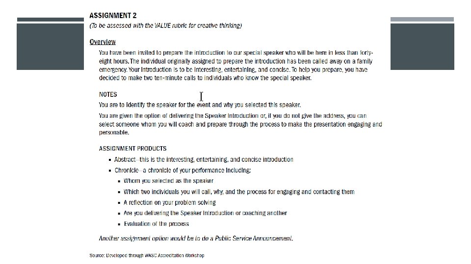 AAC&U’S 15 VALUE RUBRICS Intellectual and Practical Skills: Inquiry and analysis Critical thinking Creative thinking Written communication Oral communication Quantitative literacy Information literacy Teamwork Problem solving Personal and Social Responsibility: Civic knowledge and engagement—local and global Intercultural knowledge and competence Ethical reasoning and action Foundations and skills for lifelong learning Integrative and applied learning