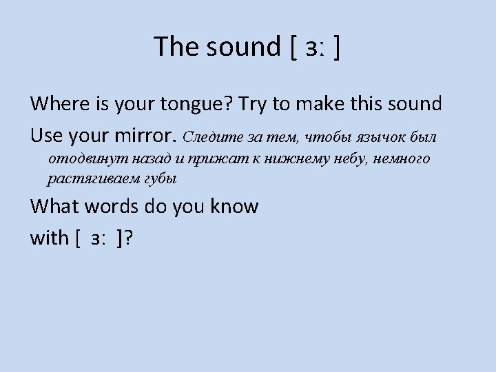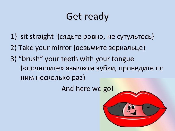 Lets speak English Mind your pronunciation The sound Slides: 21 Download presentation Let’s speak English Mind your pronunciation The sound [ s ] Where is your tongue? Try to make this sound What words do you know with [ s ]? circus cinema The sound [ θ ] Where is your tongue? Try to make this sound What words do you know with [ θ ]? theatre think girl learn The sound [ɔ: ] Where is your tongue? Try to make this sound Use your mirror. Words? mall call The sound [ŋ] Where is your tongue? Try to make this sound Use your mirror. Отличие от звука [n]? Do you know any words? bowling sitting Imagine… Call your friend and say… Where can we go? to somebody’s place to the park To the mall/shopping centre to theatre to the cinema