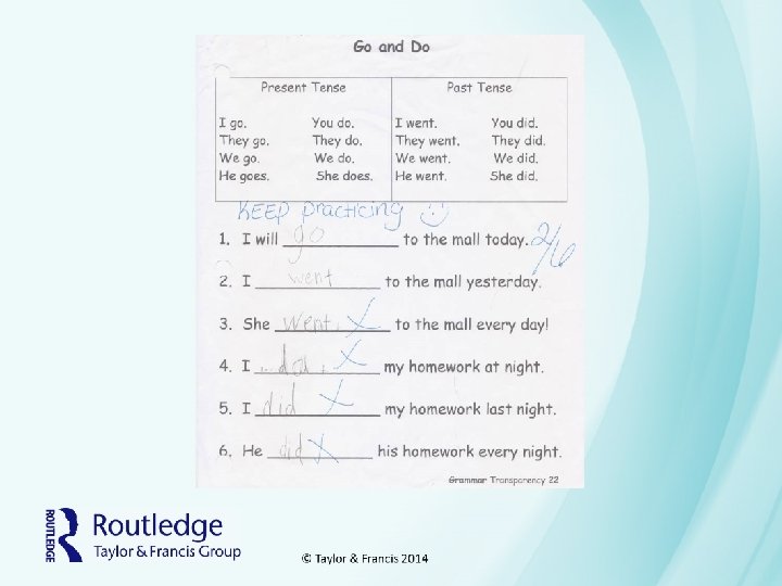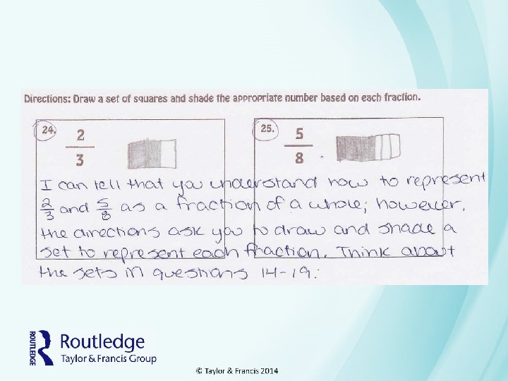 Giving Feedback • Let’s practice giving feedback with the set of papers you have brought to class • Think about what questions you would ask to facilitate your students’ learning throughout the lesson. • What comments would you write on the papers?