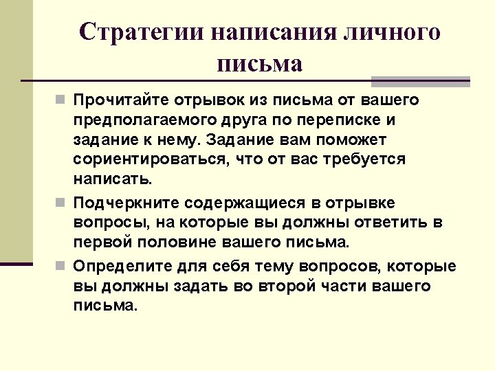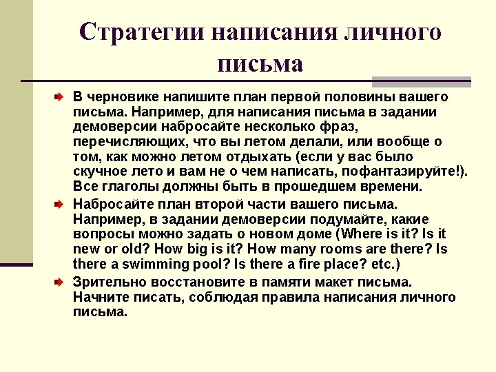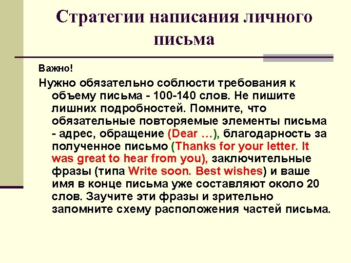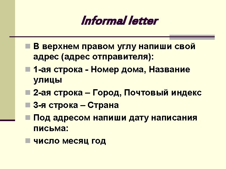 Writing informal letters ( отрывок из письма) … I hope you enjoyed your summer holidays. Where did you spend them? Please, tell me about the most interesting things you did. By the way, we are moving house and I am sending you my new address.