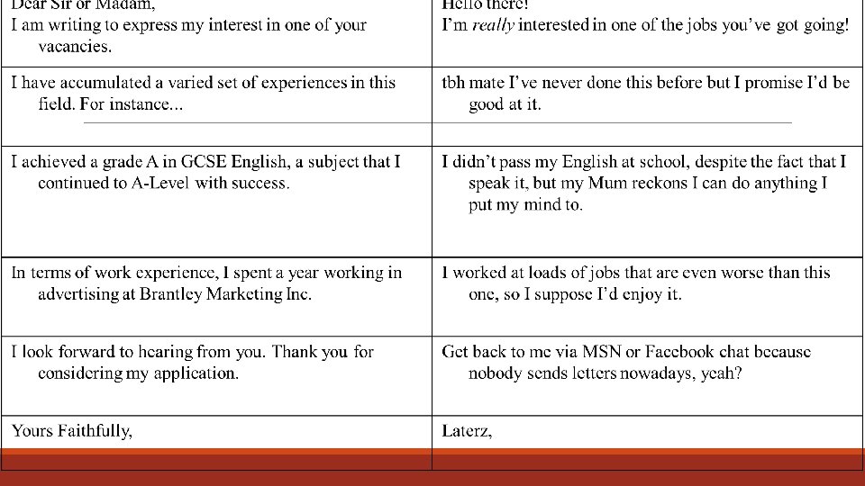 Learning Outcomes 1. To understand what is included in a formal letter and in particular what is involved in writing a letter of application for a job.