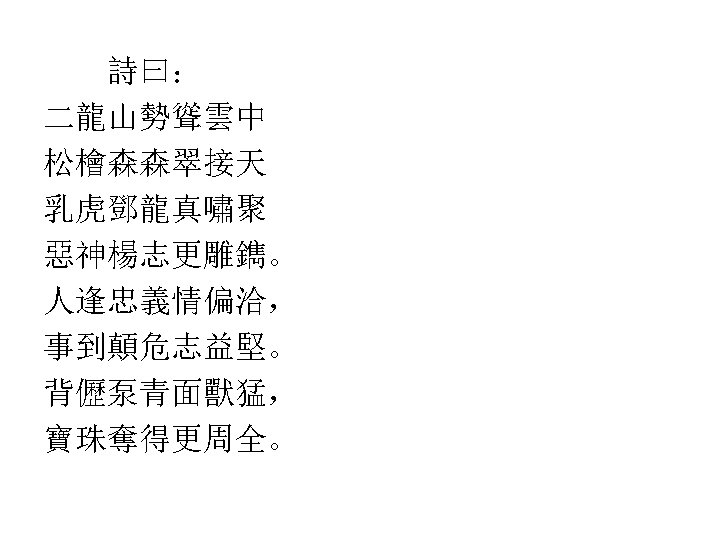 话说杨志当时在黃泥岗上,被取了生辰纲 去,如何回转去见梁中书,欲要就岗子上自 寻死路。 Narra la storia che Yang Zhi, mentre si trovava sulla Cresta di Fango Giallo, si era fatto portare via il regalo di compleanno; come tornare al cospetto del ministro Liang? E decise di cercare un posticino sul monte dove cercare la morte. �
