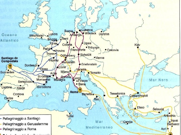 Il pellegrinaggio come viaggio Centralità del pellegrinaggio nel Medioevo valenza religiosa ed economica Nascita di guide destinate ad offrire consigli ai viaggiatori + fornire indicazioni sul percorso da seguire + far conoscere ai pellegrini episodi indispensabili per la venerazione dei santi di cui chiedevano l’intercessione