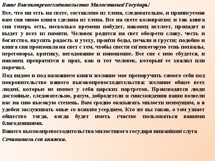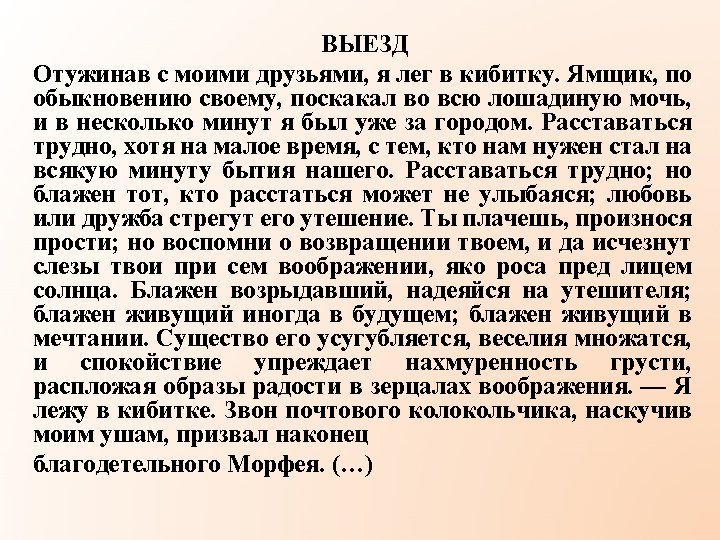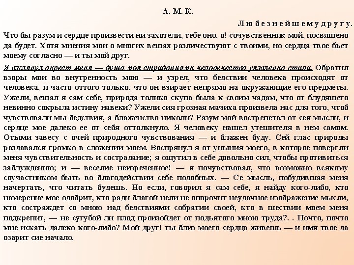 estetica del sentimentalismo (preromanticismo) – esperienza interiore come fonte della creazione letteraria – scopo della letteratura: autoanalisi, riflessione sul luogo dell’uomo nel mondo, esposizione dei legami autentici tra gli esseri umani – tendenze democratiche, antifeudale – basi filosofico ideali: empirismo gnoseologico e sensualismo (D. Hume, É. Condillac); concezione antropologica di J. -J. Rousseau – caratteristica delle opere letterari: “sensibilità”, semplicità della composizione e dello stile – temi e motivi: confronto del mondo “corotto” della civiltà (con i suoi valori finti, la sua insincerità, disuguaglianza, alienazione) e della personalità (con i suoi valori emozionali, i legami familiari e amichevoli autentici) – nuovo tipo di soggetto lirico: uomo sensibile, virtuoso, representante della sfera delle esperienze private, soggettive, fugace e teneri – formazione degli attrezzi per l’analisi psicologica delle condizioni emozionali
