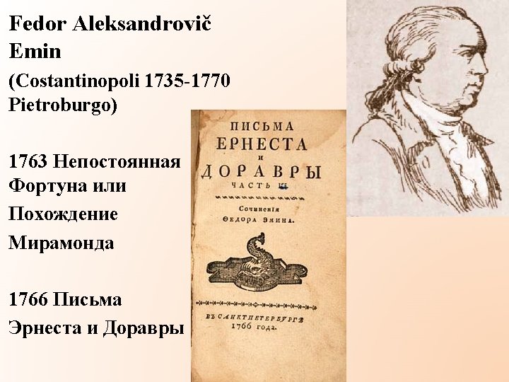 Nella seconda metà del Settecento nella letteratura europea ascesa del romanzo Attraverso le traduzioni giungono in Russia i testi e i motivi del preromanticismo e del sentimentalismo J. Macpherson I canti di Ossian (1762)
