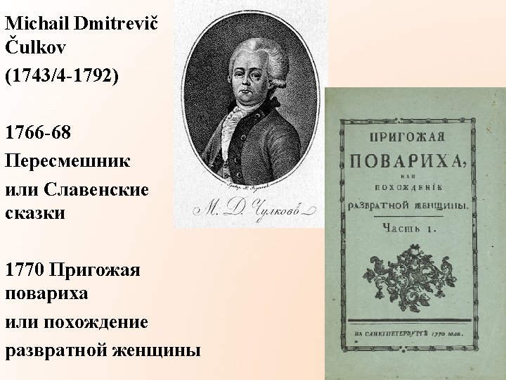 La prosa russa nel Settecento a) Romanzo elevato: politico, utopico. Mondo ideale, razionalismo, ordine. b) Romanzo basso: picaresco, avventuroso. Mondo terreno, fuori dalla morale religiosa, rifiuto dell’astrazione, il mondo come caos, il motivo del “denaro”.