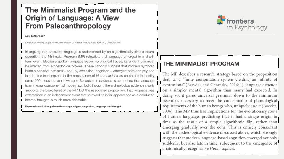 ■ Due teorie si contendono le ipotesi sull'origine del linguaggio: la teoria della discontinuità di Noam Chomsky e la teoria del protolinguaggio di Derek Bickerton. Chomsky rigetta le teorie evoluzioniste del linguaggio e sostiene che il linguaggio attinge a una dotazione biologica innata, appartenente al DNA umano, non derivante da sistemi comunicativi precedenti. Egli ipotizza che alcuni elementi sconnessi si siano aggregati in modo imprevisto e abbiano formato la grammatica universale. Questa ipotesi è detta del salto linguistico. Bickerton propone invece che gli ominidi abbiano incominciato a parlare un linguaggio molto rudimentale, un protolinguaggio composto solo da parole e privo di grammatica la cui comprensibilità era affidata al contesto d’uso.