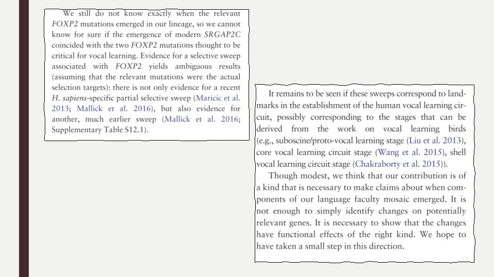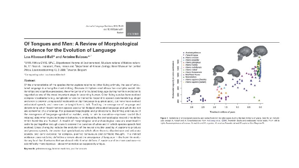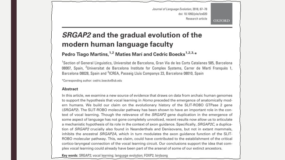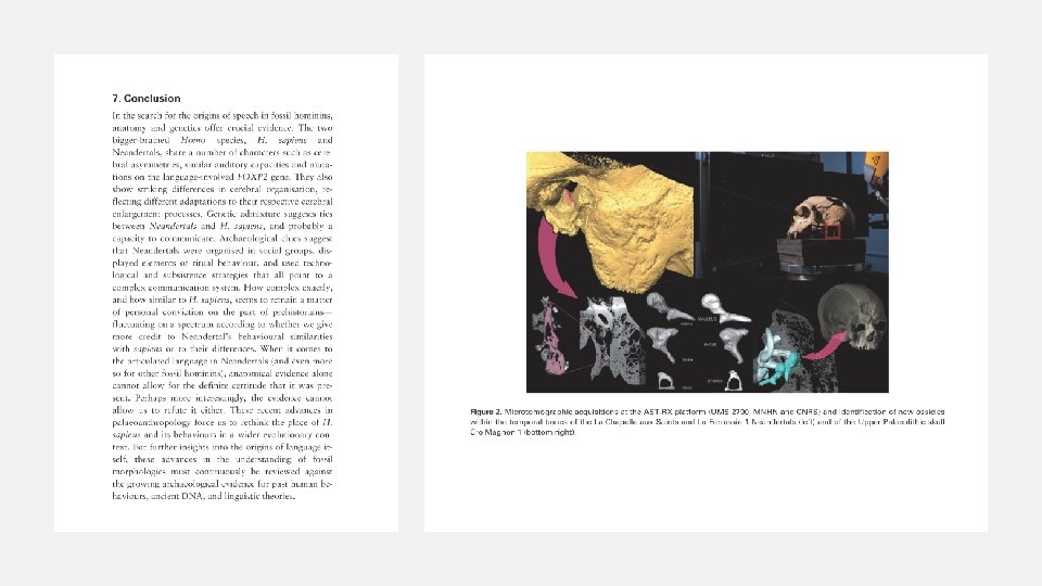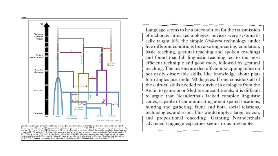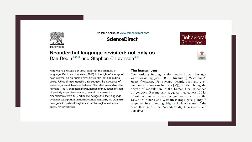 GENE FOXP 2: nell’Uomo moderno implicato nel linguaggio articolato In Homo neanderthalensis codifica una proteina identica a quella dell’Uomo moderno Quindi era già presente nel loro antenato comune più di 400. 000 anni fa. La ricostruzione della corteccia cerebrale dei neandertaliani aveva già permesso di definire come fossero presenti sia l’area di Broca che quella di Wernike Lo studio dell’osso ioide dei fossili di Kebara e la ricostruzione della posizione della laringe (necessaria per la fonazione) hanno permesso di stabilire come Homo neanderthalensis potesse emettere suoni articolati I NEANDERTALIANI AVEVANO TUTTI IL NECESSARIO PER IL LINGUAGGIO ARTICOLATO