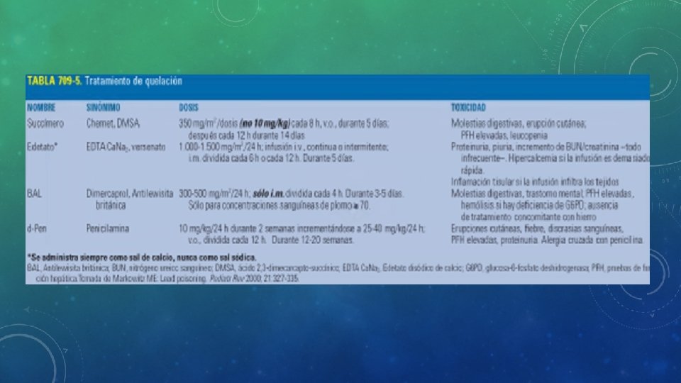 DIAGNOSTICO Y TRATAMIENTO Diagnostico • Plomo en Sangre periférica: > 10 μg/ dl • Nivel de hierro • Conteo sanguíneo completo (CSC) y estudios de coagulación • Radiografía de Huesos largos