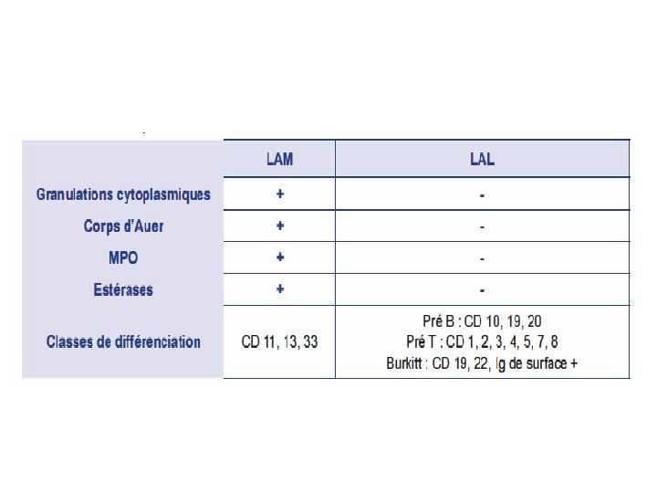 Classification cytologique des LA (FAB) Type FAB Définition LAM 0 Indifférenciée LAM 1 Sans maturation LAM 2 Avec maturation LAM 3 promyélocytaire LAM 4 Myélo-monocytaire LAM 5 monoblastique LAM 6 érythroleucémie LAM 7 mégacaryocytaire Description LAL 1 Petits lymphoblastes LAL 2 Lymphoblastes de taille et forme hétérogène LAL 3 Burkitt