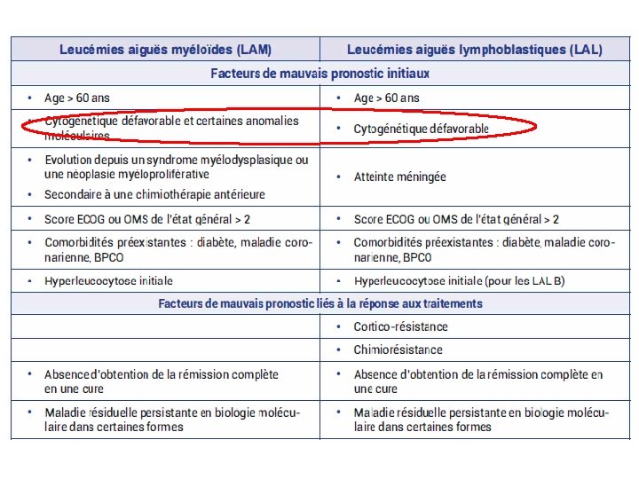 IX- Pronostic - IIaire à une chimio ou hémopathis préexistante - Mauvais Pc LAL meilleur pronostic chez Enfant Age LA IIaire GB > 30 G/l diminution de la survie Pronostic - Les + importantes sur le plan PC - Exp : LAM: caryotype complexe, mutation FLT 3 (mauvais Pc) LAL: t(9; 22), t(4; 11) de mauvais Pc Cyto. G et bio mol SNC Immuno- phénotype LA biphéno de mauvais pronostic Mauvais pronostic