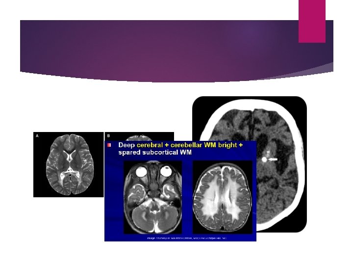 Leukoencephalopathies Associated with Calcifications Aicardi- Goutieres syndrome Naku-Hakola's disease Cerebrotendious Xanthomatosis Cystic leukoencephalopathy without megalencephaly (RNASET 2 -deficient cystic leukoencephalopathy) Labrune's syndrome (cerebroretinal microangiopathy with calcifications and cysts, Leukoencephalopathy with calcification and cyst) Cockayne 's syndrome Krabbe Metabolic diorders (Aminoacidopathies, Mitochondrial)