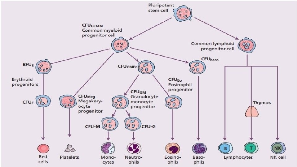 Granulocytic series • Production of Neutrophils, Eosinophils, Basophils • When the colony-forming-unit-granulocyte-erythrocyte-monocytemegakaryocyt (CFU-GEMM) progenitor cell differentiates into the colony-forming-unit-granulocyte-macrophage (CFU-GM) progenitor cell, the cell line becomes committed to developing into a myeloblast.
