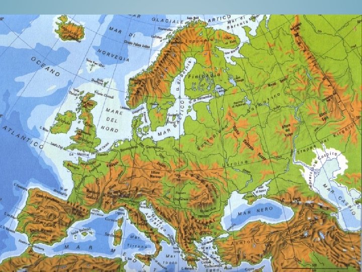 I RILIEVI PIÙ ELEVATI SORGONO A SUD • Penisola iberica: Cordigliera Betica, Pirenei. • Penisola italiana: Appennini e Alpi. • A est: Carpazi, Balcani, Rodopi, Alpi Dinariche. • A est del mar Nero: Caucaso. • Fascia centrale: Massiccio Centrale, Vosgi, Selva Nera, Harz, Massiccio Boemo. • Estremo est: Urali. • Isole britanniche: monti Pennini e Grampiani. • Penisola scandinava: Alpi Scandinave. • Pianura russa interrotta da modesti rilievi: Rialto Centrale Russo, Alture del Volga.