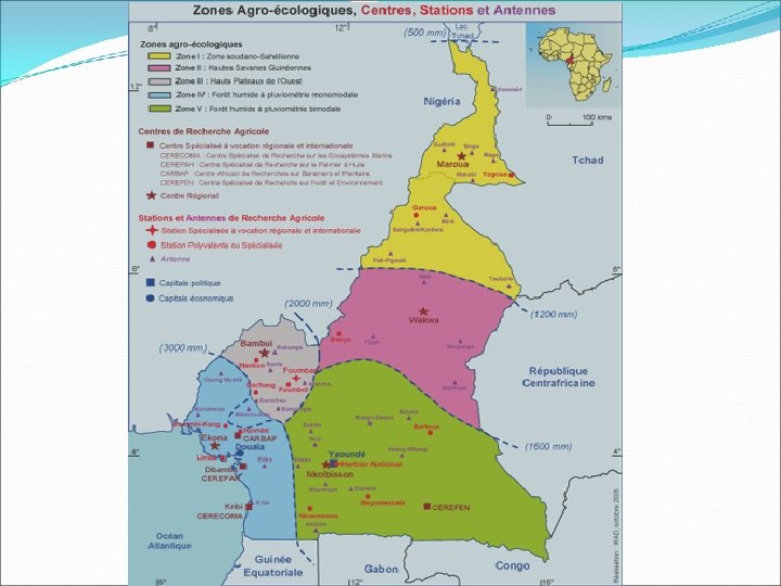 ØLe Cameroun s’étire sur presque toute la largeur de la zone intertropicale nord. Ici le front intertropical est le principal déterminant du climat. Il se déplace au cours de l’année entre les tropiques de cancer et de capricorne et traverse l’équateur deux fois, il y pleuvra tout le temps alors que la pluviométrie va diminuer en direction des tropiques ØLe Cameroun épouse ainsi tous les types de zones géoclimatiques de la zone intertropicale nord : équatorial, guinéen, soudanien et sahélien ØLa diversité géoclimatique entraine une