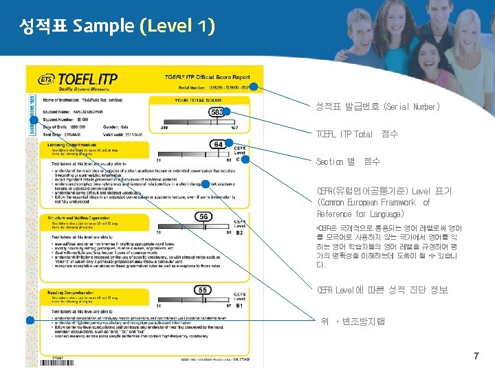 TOEFL ITP vs TOEFL i. BT 점수 상관 관계표 TOEFL PBT(ITP) TOEFL i. BT 640 -677 111 -120 590 -637 96 -110 550 -587 79 -95 ▶ ETS TOEFL 개발진이 직접 출제하는 TOEFL ITP는 문제 개발 프로세스는 물론, 513 -547 65 -78 447 -510 53 -64 437 -473 41 -52 397 -433 30 -40 347 -393 19 -29 310 -343 9 -18 310 0 -8 출제 및 채점 방식이 TOEFL PBT와 동 일 ▶ TOEFL i. BT 점수와 높은 상관관계 출처: ETS 6
