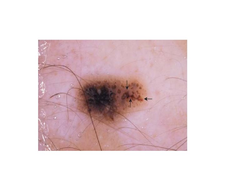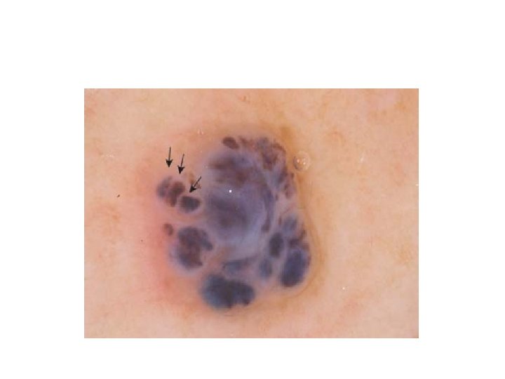Nodular pigmented BCC • Leaf-like areas • Multiple blue-gray ovoid nests (arrows) • A telangectasia in the right part of the lesion.