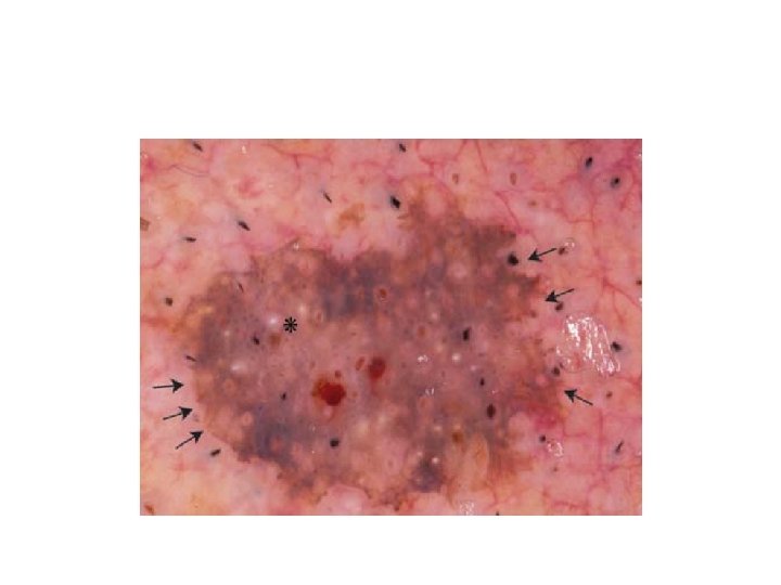 Pigmenmted BCC • Arborizing telangiectasia (arrows) • Ulceration (arrowheads) • Multiple leaf-like areas (asterisks).
