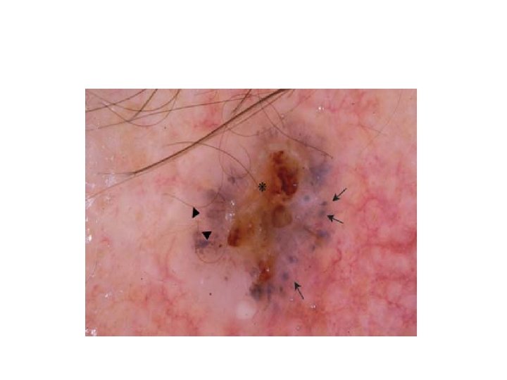 • Multiple blue-gray nonaggregated globules (arrows) • Blue-gray ovoid nests, ulceration (asterisks) • Arborized telangiectasia (Arrowheads).