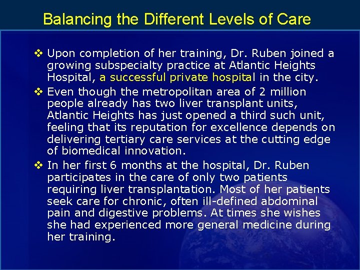 Balancing the Different Levels of Care v Upon completion of her training, Dr. Ruben joined a growing subspecialty practice at Atlantic Heights Hospital, a successful private hospital in the city. v Even though the metropolitan area of 2 million people already has two liver transplant units, Atlantic Heights has just opened a third such unit, feeling that its reputation for excellence depends on delivering tertiary care services at the cutting edge of biomedical innovation. v In her first 6 months at the hospital, Dr. Ruben participates in the care of only two patients requiring liver transplantation. Most of her patients seek care for chronic, often ill-defined abdominal pain and digestive problems. At times she wishes she had experienced more general medicine during her training.