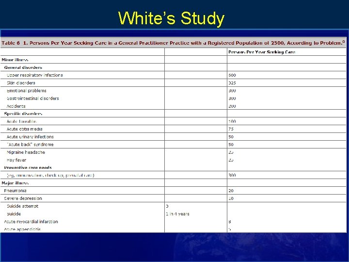Balancing the Different Levels of Care v In an article entitled "The Ecology of Medical Care" published over 4 decades ago, Kerr White recorded the monthly prevalence of illness for a general population of 1000 adults. v In this group, 750 experienced one or more illnesses or injuries during the month. Of these patients, 250 visited a physician at least once during the month, nine were admitted to a hospital, and only one was referred to a university medical center.
