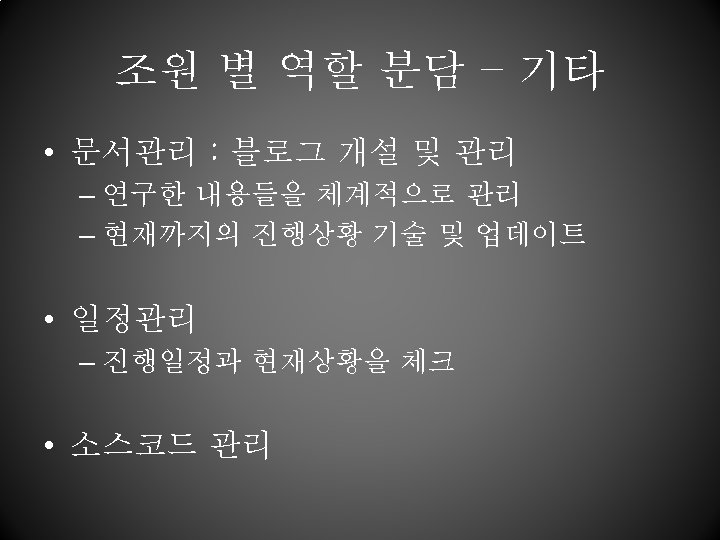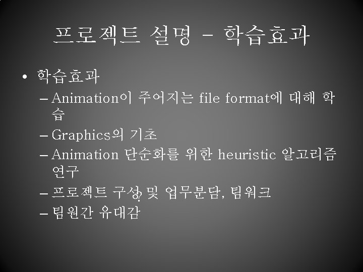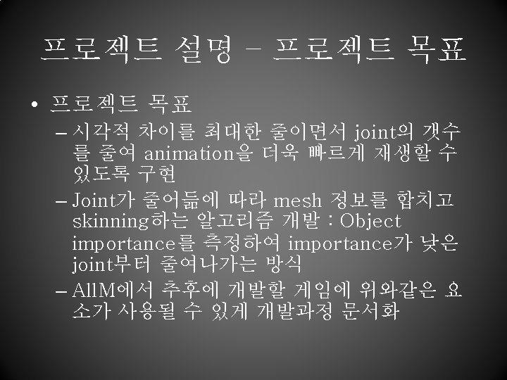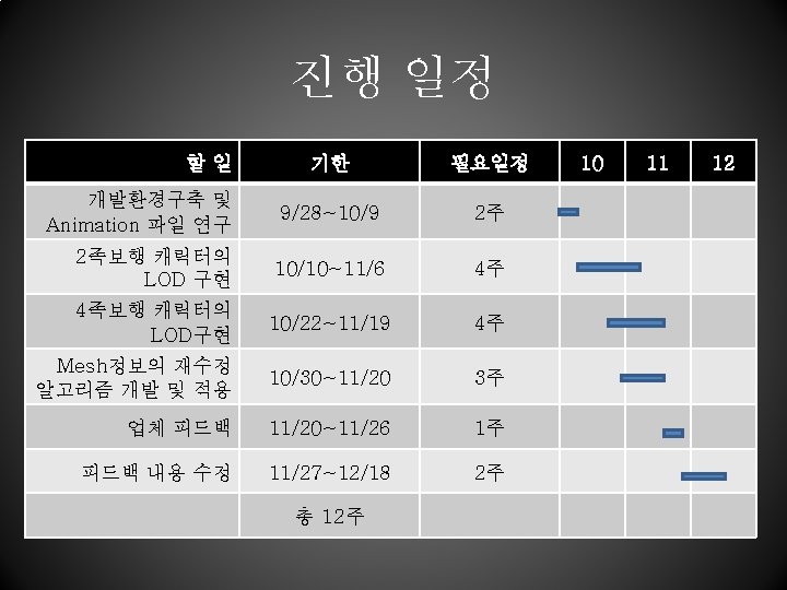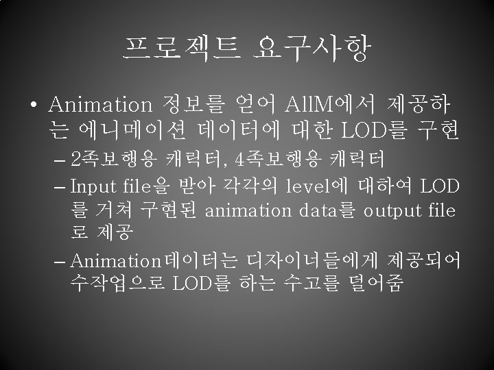 조원 별 역할 분담 – LOD연구 • 2족보행과 4족보행용 알고리즘, mesh 재 수정 및 skinning, data conversion to animation file from the output file 담당 김청림 이성원 황현오 연구 파트 4족보행 LOD, data conversion 2족보행 LOD, animation testing Mesh 재수정 및 skinning