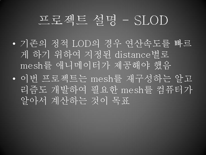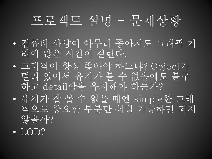 프로젝트 설명 - LOD • decreasing the complexity of a 3 D object representation as it moves away from the viewer or according other metrics such as object importance, eye -space speed or position. (from Wikipedia “http: //en. wikipedia. org/wiki/Level_of_ detail”) • 멀리 있는 object는 간단하게, 가까이 있는 object는 디테일하게 표현하는 방법