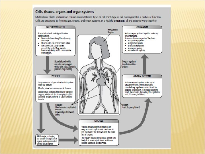 AND THE ANSWERS ARE…… • Cells • Plant cell vacuole • Red blood cell • Nerve cell • Organs • Plant leaf • Plant roots stems leaves • Animal organs • Tissues • Heart muscle • Elodea leaf • Plant water transport (vascular tissue) • Organ • Root System system • Flower reproductive parts • Human brain and spine
