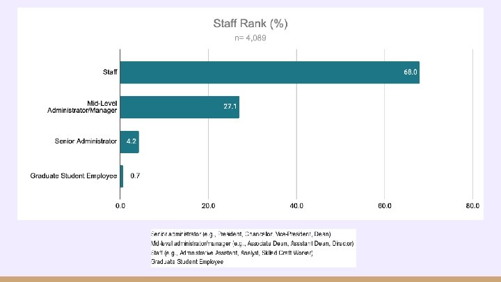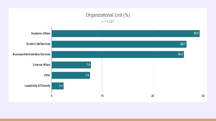 ❖ “Staff do not have a voice at this institution. There is no consideration of staff in making policy. ” Open-ended Responses ❖ “Leadership ends up making decisions that affect all types of stakeholders in the campus community without taking the staff opinions into consideration. ” ❖ “I believe the University's governance structure does not provide a space for student affairs professionals to have an equal voice in the University. ”