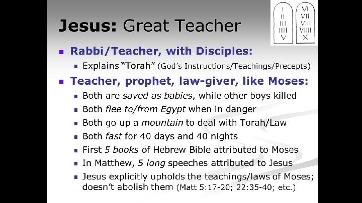 1) 2) 3) 4) The Law The 10 commandments The Pentateuch (first 5 books of the Bible) The Old Testament (includes Law and Prophets) Oral law as interpreted by Scribes (Mishna and Talmud) “Until heaven and earth disappear, not the smallest letter, not the least stroke of a pen, will by any means disappear from the Law until everything is accomplished. ” (Matt. 5: 18)