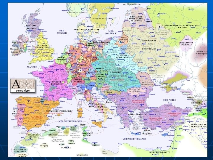 Gli Stati europei alla fine del XV secolo - - - Francia: accentramento della giustizia, delle risorse finanziarie; ascesa della nobiltà di toga; scelta dei vescovi e assegnazione delle cariche ecclesiastiche nelle mani del Re; Inghilterra: dopo la Guerra delle Due Rose 81455 -1485) i Tudor accentrarono il potere e si imposero anche sul Parlamento: governarono con il Consiglio della Corona e la Camera Stellata (tribunale politico); Spagna: l’unione di Aragona e Castiglia NON costituisce uno stato unitario: